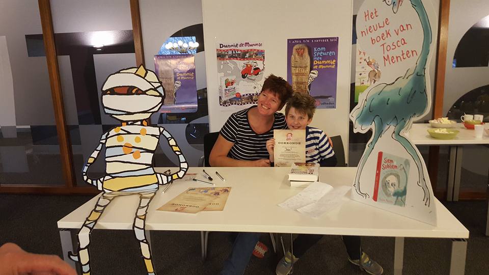 Het leukste boek van Tosca Menten vind ik Dummie de Mummie en de gouden Scarabee. Ik heb eerst de film gezien en die vond ik zo leuk dat ik ook de andere verhalen wilde weten en ben begonnen met lezen van de boeken. Nu is dat voor mij niet zo makkelijk omdat ik dyslexie heb en slechthorend ben. Maar door de boeken van Tosca Menten ben ik gaan lezen. Ook luister ik naar de gesproken boeken. De boeken die Tosca zelf voorleest zijn mijn favoriet!