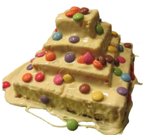 Leg de cakes op hun kant en snijd ze in twee of drie grote platte stukken. Leg twee plakken tegen elkaar op een groot bord en snijd ze zo af dat je een vierkant overhoudt. Herhaal dit en maak zo vierkanten van verschillende formaten. Leg de vierkanten op elkaar, de kleinste bovenop. Als je nog cake overhebt, maak je een puntje voor de top (als je dan nog steeds cake overhebt, eet je dat maar op). Doe de witte chocola in een pannetje, zet dit pannetje op een groter pannetje waar water in zit en breng dat water aan de kook. De chocola in het kleine pannetje zal nu langzaam gaan smelten. Denk erom: goed roeren! Als alles gesmolten is, smeer je het over de piramide heen. Duw snel gekleurde m&m’s in de chocola. Zet de piramide twee uurtjes in de koelkast. Hou je niet van witte chocola? Neem dan gewoon bruine. Een bruine piramide ziet er misschien uit als een enorme kamelendrol, maar is ook heel lekker…
