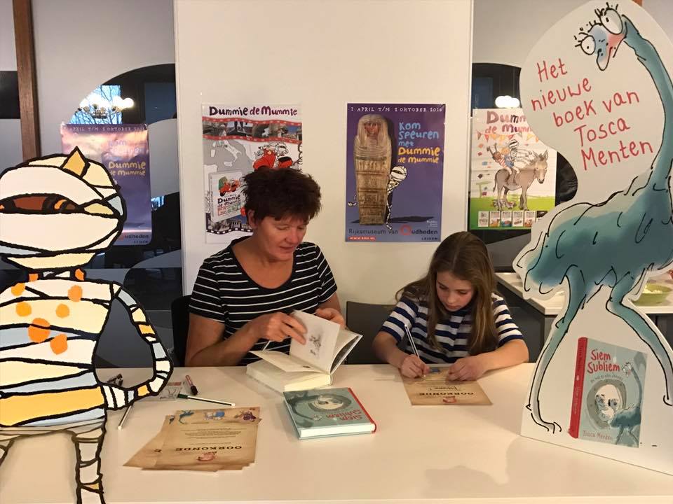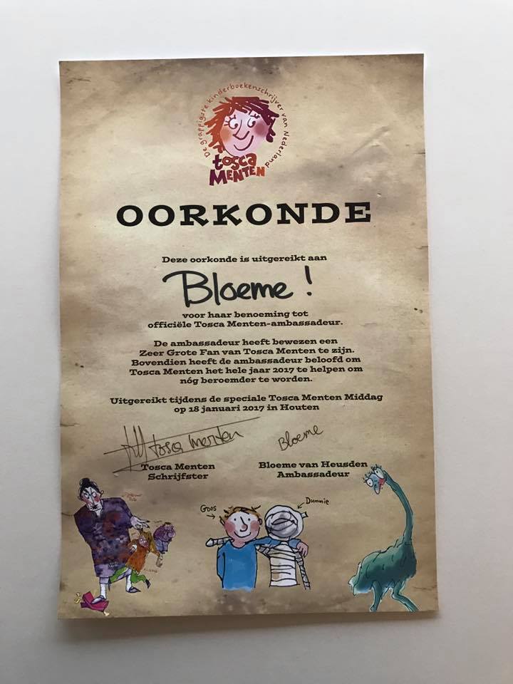 Hoi! Ik heet Bloeme, ik ben 9 jaar en op 16 mei jarig. Ik woon in Naarden. Daar woon ik samen met: mijn broertje Ole, papa Sven, mama Eliette en twee katten Bobbie en Siepie. Mijn hobby’s zijn hockey, pianospelen en tennis. Ik zit in groep 6 van de Minister Calsschool bij juf Jacqeline. Ik wilde ambassadeur van Tosca Menten worden omdat haar boeken super leuk, gek en spannend zijn, dus daarom maakte ik een filmpje. Een paar dagen later kreeg ik een mailtje dat ik ambassadeur was en ik sprong een gat in de lucht!
