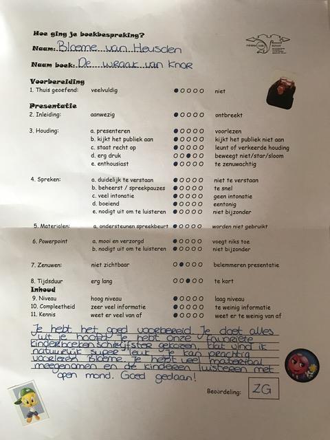 Bloeme hield een spreekbeurt gehouden over ‘De wraak van Knor’ en dit vond de juf ervan…