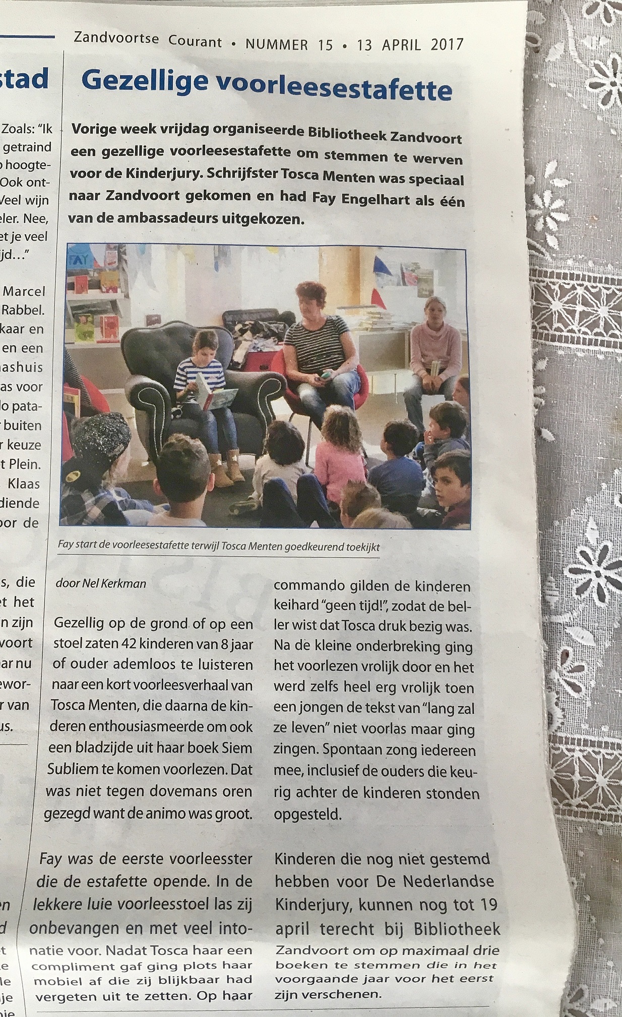 Ja het is echt waar: Tosca doet mee aan mijn voorleesestafette in de Zandvoortse bieb!! Wat dat is? Eigenlijk heel simpel: Tosca start met voorlezen uit Siem Subliem of zal ik zelf beginnen…? Nou dat moeten we nog even beslissen. Dan geven we Siem door aan de volgende die verder voorleest. Zo leert iedereen Siem Subliem kennen. Natuurlijk kunnen we Siem niet in één x uitlezen dus op een spannend stukje stoppen we. Alle kinderen denken dan “ik móet weten hoe het verder gaat” en zullen vervolgens Siem Subliem kopen of lenen in de bieb. En natuurlijk zetten ze Siem Subliem bovenaan hun stemformulier van de Kinderjury!