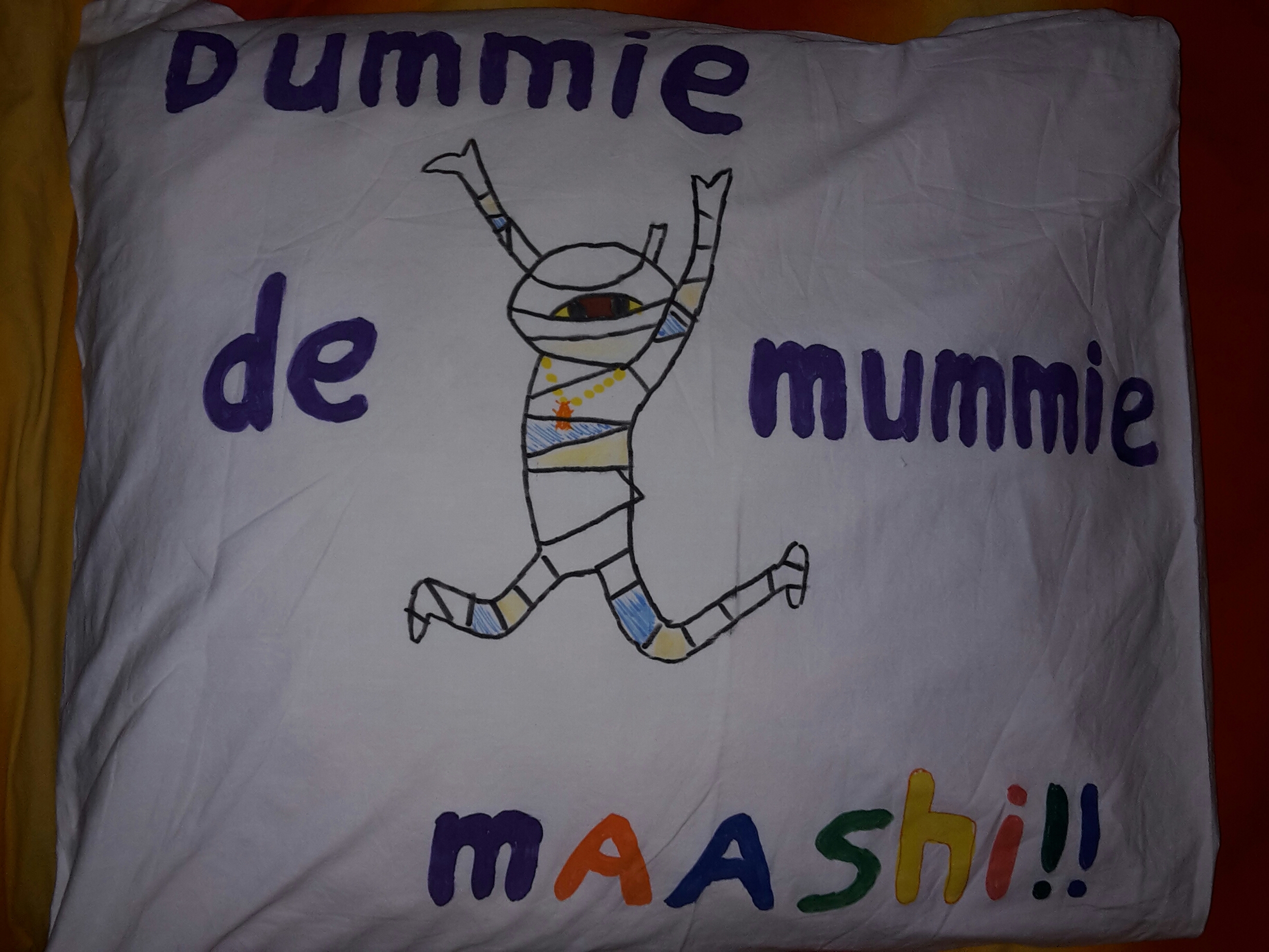 Mijn moeder heeft me geholpen een mal te tekenen. Die leg je dan in een witte kussensloop of in een wit t-shirt.