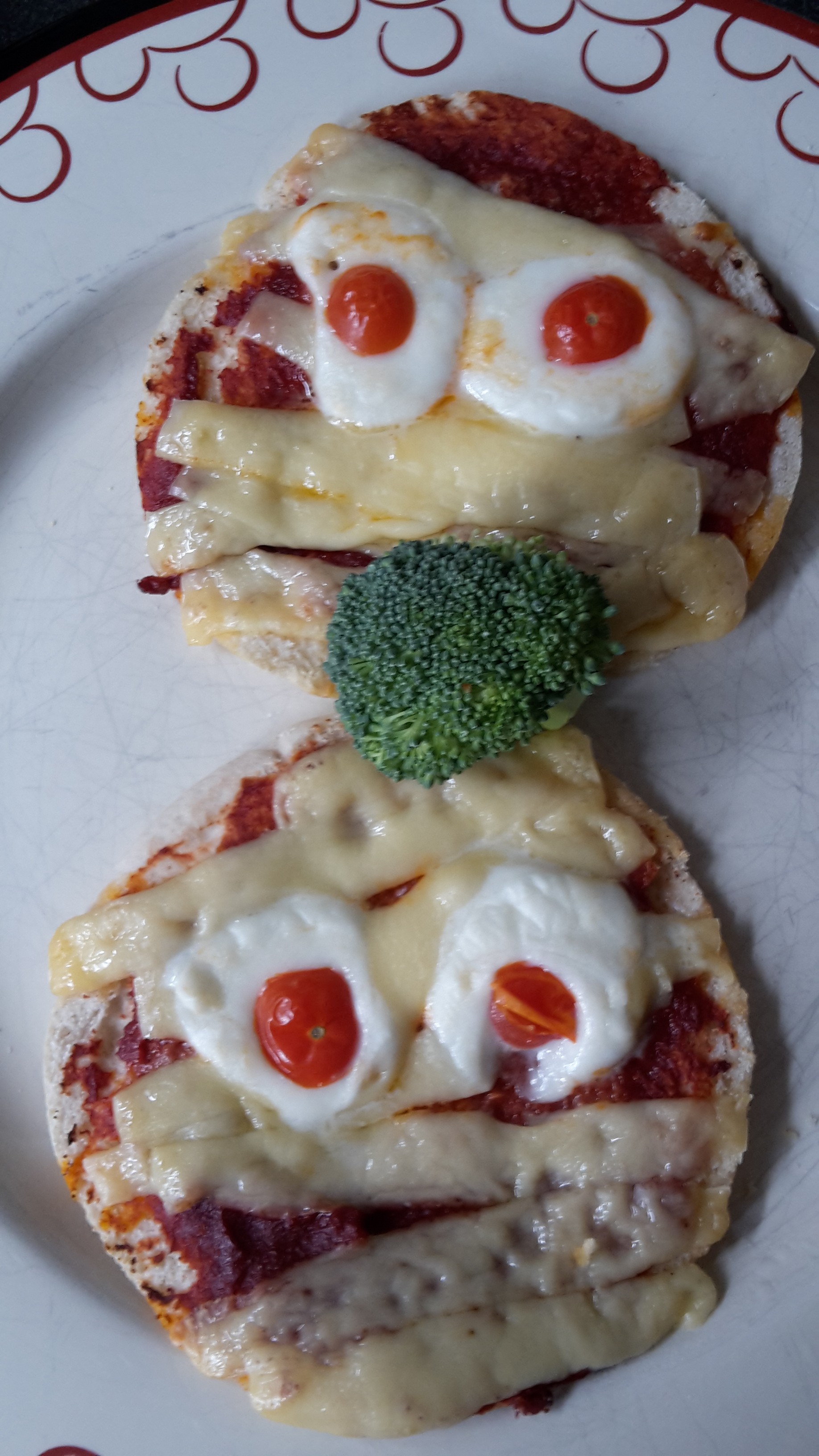 Voor de ogen heb ik een klein mozzarella bolletje door midden gesneden. Daar het puntje van een snoep tomaatje op gelegd. Dan kan hij in de oven. 180 graden en 10 minuten.