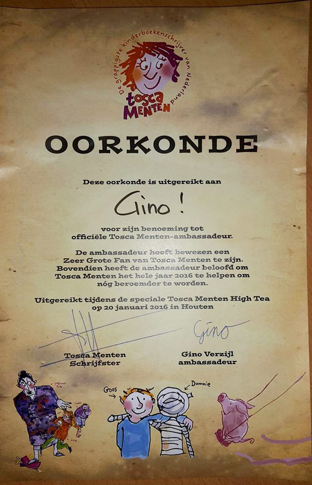 Na dat we de oorkonde kregen, gingen we de groepsfoto maken. Met Tosca, Dummie, Knor en Lorre. Ook maakte Tosca nog een filmpje voor op haar site. Ik ben erna nog met Dummie en Tosca op de foto geweest. Toen was het echt afgelopen en moesten we weer naar huis. Het was een hele bijzondere dag. TOSCA MENTEN IS DE BESTE EN LEUKSTE KINDERBOEKEN SCHRIJFSTER! Ik heb super veel zin in dit jaar en ben al benieuwd naar de eerste opdracht.