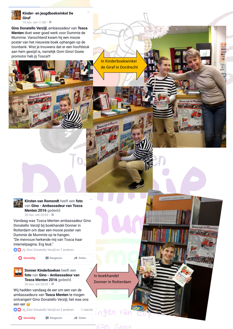 “Vandaag was ik in de kinderboekenwinkel: De Giraf in Dordrecht om het boek Oorlogswinter van Jan Terlouw te kopen. In de Giraf was het heel gezellig. Er stonden veel boeken van Tosca Menten. Goed zo! Ik kon daar ook vertellen dat ik ambassadeur ben. De verkoopsters waren dol enthousiast. Ze wilden er vanalles over weten. Ook wilden ze een foto van mij voor op hun facebook pagina. (Er komt zeker niet elke dag een ambassadeur op bezoek… smile.)