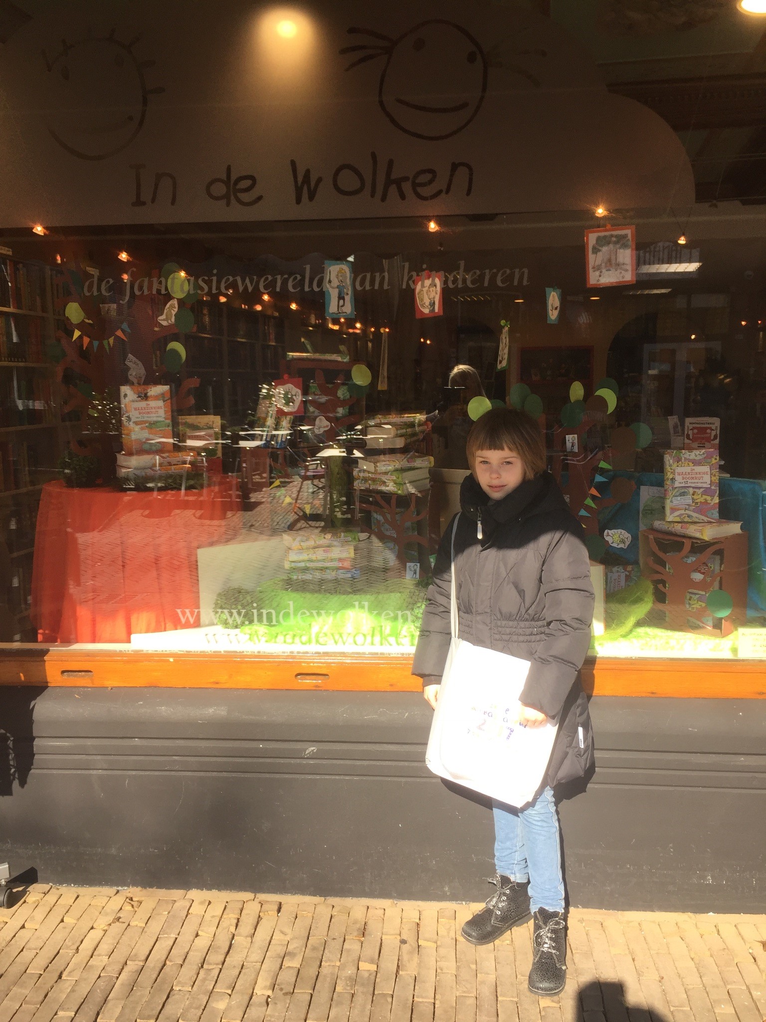 Ik ben langsgegaan bij kinderboekenwinkel ‘In de wolken’ in Voorburg. Daar heb ik promotiemateriaal en mijn prijsvraag op een mooi plekje neer mogen leggen…