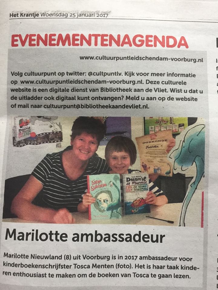 In mijn ambassadeursjaar wil ik de volgende dingen doen: Het lijkt me leuk om winacties te organiseren op bijvoorbeeld mijn school, sportclub en bibliotheek. En natuurlijk ga ik een spreekbeurt in de klas houden over Tosca Menten en haar boeken! Ook wil ik proberen regelmatig in ’t Krantje van Voorburg-Leidschendam te komen, zodat iedereen kan lezen hoe leuk Tosca Menten is.
