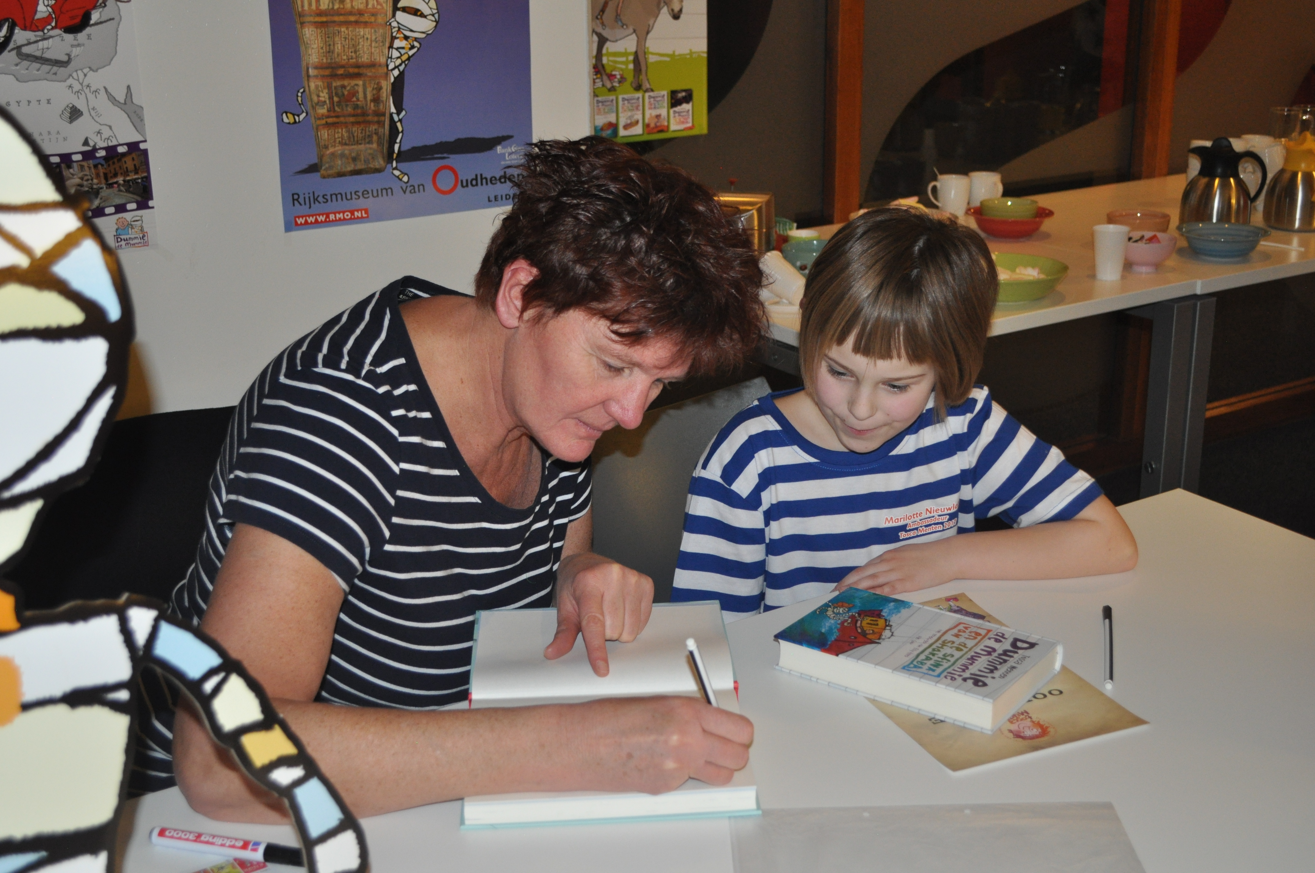 Superleuk was het. Tosca heeft ons een heleboel verteld (ook geheimen, maar daar kan ik natuurlijk niks over zeggen). Daarna kregen we het ambassadeurs T-shirt en een tas met boeken en andere leuke spullen. Er was een heerlijke taart en lekkere snoepjes, daar heb ik van gesmuld.